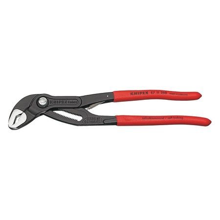 ' Tongue and Groove Plier, Plier Jaw Style V-Jaw, Adjustment Type Push Button, Handle Type Dipped, Overall Length 10 In., Max. Jaw Opening 2 In., Standard Tool (Accessory Needed for Tethering), No. of Jaw Positions 25, Jaw Length 3/4 In., Jaw Width 7/8 In., Chrome Vanadium Electric Steel Material, Polished Finish, Spring Loaded, Pinch Guard Prevents Operators' Fingers from Being Pinched, Induction Hardened Teeth, Robust Construction, Particularly Suitable for Heavy Duty Work '