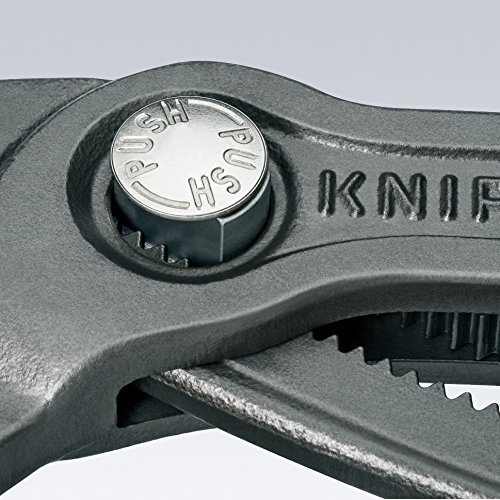 - ●KNIPEXの“コブラ”は高性能なウォーターポンププライヤーです。 ●ジョイント部は横方向へのブレを防止する3枚合わせ(ボックスジョイント)。 ●プッシュボタンにより、素早く簡単にアゴの幅を細かく調整できます。 ●アゴの開き調整はプッシュボタンにて行うため、作業中は不意に口幅が変わらないので安心です。 ●アゴの開きは片手で調節が可能です。 ●アゴの開き幅の調整に時間を必要としません。上のアゴを対象物にあて、プッシュボタンを押しながら、下アゴを上にスライドさせるだけで簡単に調整することができます。 ●口幅を最大に調節して握っても、ハンドルの間にクリアランスを確保する指詰めストッパー付き。 ●少ない力でパイプやナットを確実につかむ平行四辺形のアゴ形状。 ●てこの原理を最大限発揮するデザインで高いグリップ力を発揮します。 ●入念な焼入れ処理が施されたつかみ面の硬度は約HRC61で、耐磨耗性が高く、確実なグリップを発揮します。 ●材質はオイル焼き入れ焼き戻し処理済みのクロームバナジウム電気鋼。