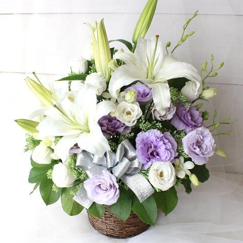 - 【サイズ】 高さ:約50cm 幅:約45cm 【商品内容】 ユリ・トルコキキョウ・デンファレ・その他小花・グリーンもの/お手入れのしおり 品質保証書 メッセージカード(希望者のみ) ※商品写真はイメージ写真になります 花材、色目、形態が多少写真と異なる場合もございます。※記載されてる以外の写真の小物類は商品に含まれません。※急なご注文は場所や花材をご指定通りにお届けできない場合もございます。ご了承下さいませ。