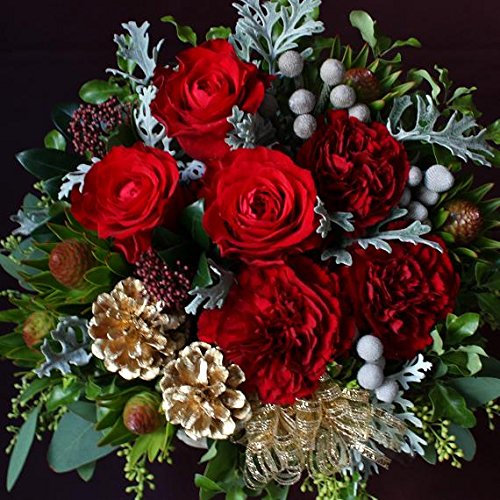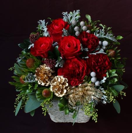 - クリスマスにふさわしいゴージャスなアレンジメント。深紅のバラと、それぞれ表情の違うグリーンもの、木の実をふんだんに使用したボリューム感のあるアレンジメントです。大人からお子様まで喜ばれること間違いなし!!クリスマスプレゼントやお誕生日・記念日のお祝いにぴったりな生花アレンジメントです。