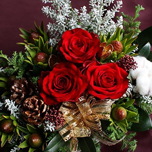 - とても美しい深紅のバラとシルバーツリーの組み合わせ。華やかさの中に、たくさんの松ぼっくりや木の実が入って、よりナチュラル感があります。クリスマスプレゼントとしても、クリスマスパーティーの飾りとしてもおすすめのアレンジメント。大人からお子様まで喜ばれる楽しい生花アレンジです。