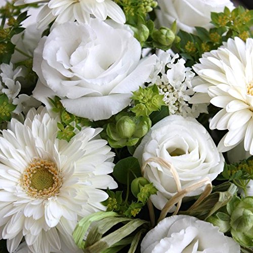 - 【サイズ】 高さ:約25cm 幅:約25cm 【商品内容】 白ガーベラ 白トルコキョウ デルフィニーウム 白小花 グリーンもの/お手入れのしおり 品質保証書 メッセージカード(希望者のみ) ※商品写真はイメージ写真になります 花材、色目、形態が多少写真と異なる場合もございます。※記載されてる以外の写真の小物類は商品に含まれません。※急なご注文は場所や花材をご指定通りにお届けできない場合もございます。ご了承下さいませ。