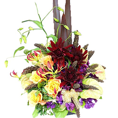 - 【サイズ】高さ:約60cm 幅:約58cm 【商品内容】ダリア グロリオサ バラ スイートピー アンスリューム その他小花 グリーンもの/カゴ/お手入れのしおり/品質保証書/メッセージカード(希望者のみ) ※商品写真はイメージ写真になります。色目、形態が多少写真と異なる場合もございます。※記載されてる以外の写真の小物類は商品に含まれません。※急なご注文は場所や花材をご指定通りにお届けできない場合もございます。ご了承下さいませ。