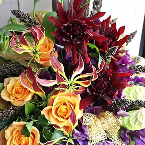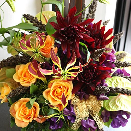 - ゴージャスなダリアと神秘的なグロリオサが共演したアレンジメントです。とてもゴージャスで華やかなフラワーアレンジメントです。目上の方への贈り物や特別なお祝いなどにおすすめのフラワーギフトです。