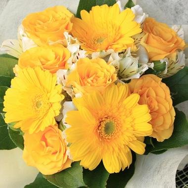 - お手頃価格のプチブーケです。ちょっとした贈り物に喜ばれます。ビタミンカラーのイエローでまとめました。
