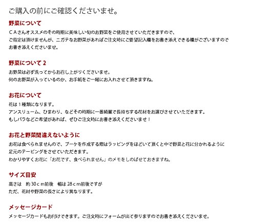 - 【サイズ】高さ:約30cm 幅:約28cm 【商品内容】花材と野菜/お手入れのしおり/品質保証書/メッセージカード(希望者のみ) ※商品写真はイメージ写真になります。自然のものですので多少花の大きさ、形に違いが出ることがございます。 ご了承ください。※記載されてる以外の写真の小物類は商品に含まれません。※急なご注文は場所や花材をご指定通りにお届けできない場合もございます。ご了承下さいませ。