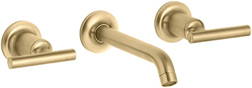 Fluid design lines for ease of cleaning. Kohler K-T14413-4-BGD Purist Two Handle Wall Mount Lavatory Faucet Trim with 6 1/4" Spout and Lever Handles, Valve Not Included, Vibrant Moderne Brushed GoldPurist faucets combine simple, architectural forms with sensual design lines and careful detailing. Both sculptural and functional, this wall-mount faucet trim promises inviting visual appeal of classic modernity, and features a 6-1/4" spout and two lever handles.Kohler K-T14413-4-BGD Purist Two Handle Wall Mount Lavatory Faucet Trim with 6 1/4" Spout and Lever Handles, Valve Not Included, Vibrant Moderne Brushed Gold Features: Kohler ceramic disc valves exceed industry longevity standards two times for a lifetime of durable performance Solid brass construction for durability and reliability Kohler finishes resist corrosion and tarnishing, exceeding industry durability standards two times Fluid design lines for ease of cleaning Modern, minimal design complements the Purist Suite and accessories Flow Rate: 1.5 gpm (5.7 lpm) ADA compliant