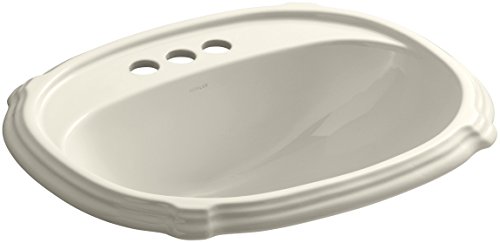 4-Inch center drilling. K-2189-4-47 Finish: Almond Features: -Charming, traditional styling integrates with the Portrait collection. -Constructed of vitreous china. -Self-rimming installation. -4" center drilling. -Artist Editions designs also available. Installation Type: -Self rimming sink. Style: -Traditional. Sink Shape: -Oval. Material: -Ceramic. Number of Faucet Holes: -3. Overflow: -Yes. Commercial Use: -Yes. Country of Manufacture: -United States. Dimensions: Overall Length - Side to Side: -22.625". Overall Width - Front to Back: -18.875". Overall Depth - Top to Bottom: -8.875". Basin Length - Side to Side: -20". Basin Width - Front to Back: -12". Basin Depth - Top to Bottom: -5". Overall Product Weight: -27 lbs.