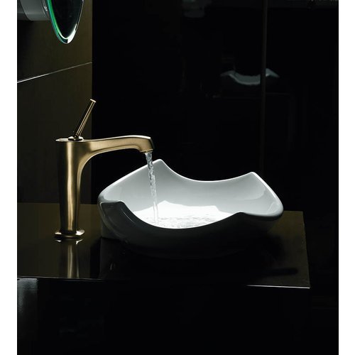 No faucet holes; requires wall- or counter-mount faucet. Shaped as if floating atop a woodsy brook, this Leaf vessel-style sink conveys a sense of nature and harmony with its gentle upturned curves. The countertop mounting makes for a stunning focal point in your bath. A polished chrome overflow cover adds the finishing touch.