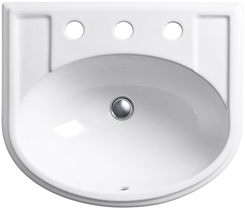 8" center drilling. K-2279-8-47 Features: -Faucet and handles not included.-Self-Rimming.-With overflow.-8'' center drilling.-An excellent fit for most vanity sizes.-Part of the Devonshire suite. Construction: -Vitreous china construction. Color/Finish: -Almond finish. Dimensions: -Water depth: 4.5''.-Basin area dimensions: 17'' x 11''.-Overall dimensions: 8'' H x 19.75'' W x 16.88'' D.