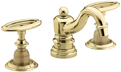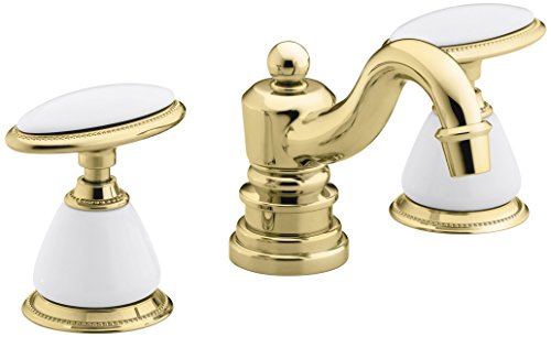 Handles pre-assembled on valves to simplify installation. Kohler K-280-9B-PB Antique Widespread Lavatory Faucet with Oval Handles, Requires Ceramic Handle Insets and Skirts, Vibrant Polished BrassThe Antique widespread lavatory faucet with oval handles has a traditional appeal that brings timeless elegance to your bath or powder room. Kohler finishes and ceramic disc valves exceed industry standards for durability and longevity two times, so you can count on years of reliable performance. The faucet includes a spout, handles, a valve, a pop-up drain with a 1-1/4" tailpiece and flexible stainless steel supplies. Ceramic skirts for the oval handles complete the faucet.Kohler K-280-9B-PB Antique Widespread Lavatory Faucet with Oval Handles, Requires Ceramic Handle Insets and Skirts, Vibrant Polished Brass Features: Two-handle widespread lavatory faucet for 8" - 16" centers Solid brass construction for durability and reliability Handles pre-assembled on valves to simplify installation Brass valve bodies Quarter-turn washerless ceramic disc valves Flexible connections for easy installation Pop-up drain with lift rod and tailpiece For 8" (20.3 cm) or 16" (40.6 cm) centers Stationary spout Oval handles 4-5/8" (11.7 cm) spout reach 1.5 gallons (5.7 liters) per minute maximum "šow rate