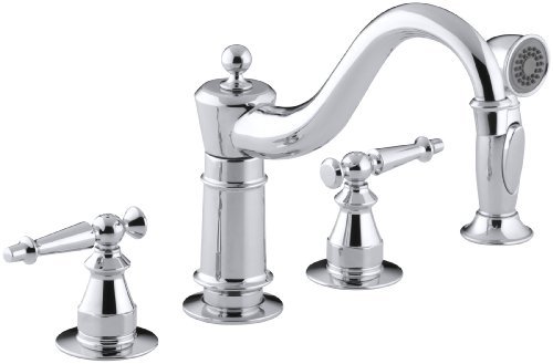 Kohler K-158-4-CP Antique Kitchen Sink Faucet with Sidespray and Lever Handles, Polished ChromeA quarter turn of these ergonomic lever handles is all it takes to start the water flowing from this elegant Antique kitchen sink faucet. Solid brass ensures durability and flexible stainless steel supplies allow installation versatility. The signature one-piece Kohler ceramic valve resists debris and hard water buildup.Kohler K-158-4-CP Antique Kitchen Sink Faucet with Sidespray and Lever Handles, Polished Chrome Features: Lever handles are ADA-compliant One-piece ceramic valve resists debris and hard water buildup Ergonomic handle rotation provides on/off water control with only a quarter turn For installation on 8" centers Solid brass construction ensures years of reliable performance Brass valve bodies Quarter-turn washerless ceramic disc valves Handspray Matching ?nish sidespray 8-5/8" (21.9 cm) spout reach Rotating spout 2.2 GPM (8.3 LPM) maximum "??ow rate Kohler lifetime limited warranty
