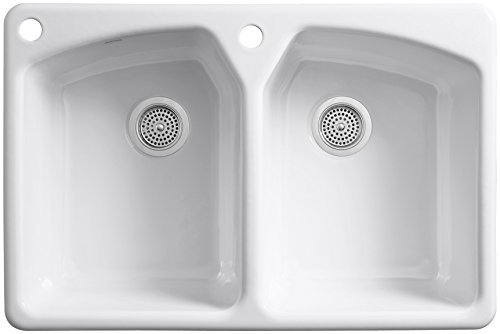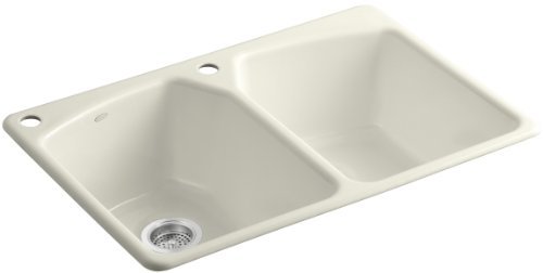 Kohler K-6491-2L-96 Tanager Self Rimming Kitchen Sink with Single Hole Faucet Drilling and One Accessory Hole At Left, BiscuitTo better align with the rapid growth of single-hole kitchen faucets in the marketplace, Kohler introduces a new cast iron kitchen sink that provides unprecedented basin space and depth in a double-equal configuration. The generous basin space is achieved by the unique single-hole drilling allowing for space usually reserved for the faucet deck to be reclaimed for the basin. The roomy basins can fit large frying pans and Dutch ovens and feature a preferred 9-inch basin depth.Kohler K-6491-2L-96 Tanager Self Rimming Kitchen Sink with Single Hole Faucet Drilling and One Accessory Hole At Left, Biscuit Features: Clean, contemporary design 33"L x 22"W Constructed of Kohler Cast Iron Basin depth: 9" Extra-large double-basin design Self-rimming installation Single-hole faucet drilling in center and accessory hole on left Kohler Cast Iron Lifetime Limited Warranty*Image shown may vary by color, finish, or material