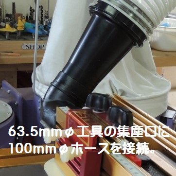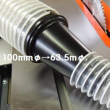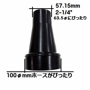 ホース変換アダプター100mmφ→57.15mmφ100mmφのホースと63.5mmφのホースに接続に100mmφのホースと63.5mmφの工具集塵口に接続可能工具集塵口の多くは63.5mmφになります。このアダプターの口は57.15mmφで、63.5mmφの集塵口にピッタリです。変換の面倒な63.5mmφが簡単に接続可能です。下記のアダプターを使用することで、100φmmφを掃除機等の使用可能な38mmφに変換も可能です。