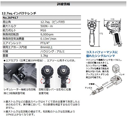 ●コンパクトで ハイパワーを実現したシングルハンマ採用モデル。 ●環境に配慮した、低騒音、エア低消費タイプ。 ●ハンマケースとハウジングの一体化構造により、当社従来品(JAP450)より全長を約30%短縮。 ●回転切替レバーは左右に位置変更できるため、右利き、左利きに関わらず片手操作が可能。 ●レギュレーターは右回転時に3段階調整が可能。 ●トリガーの引き具合で回転数の調整が可能なティージングスロットル。 ●ホースのねじれを防止する360°シーベルインレット。 ●KTCが開発したピン抜け防止安全機構 AMBAC(アンバック)システム(PAT.)に対応。