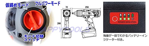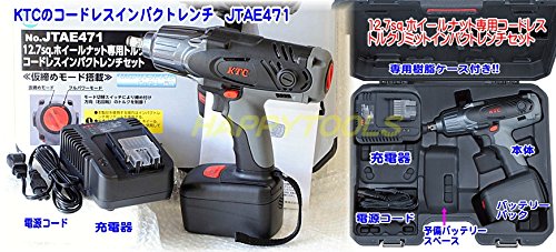 - 【JTAE471充電タイプインパクトレンチ仕様】 方式:コードレス充電式電動インパクトレンチ 四角ドライブ:12.7sq.(ピン穴付) 入力電圧:18V DC 最大トルク:フルパワーモード時→500N・m(右・左回転時) 仮締めモード時→フルパワーモード時の約15% 約75N・m(右回転のみ) 無負荷回転数:0~1,800rpm 能力ボルト:自動車用ホイールナットM10~M14 1充電当たり作業量(目安):自動車用ホイールナット緩め数:360本 キャリングケースサイズ:W440×D360×H113 重量:5.1kg(本体:2.2kg・バッテリーパック:720g) ※推奨先端工具:KTC製インパクトレンチ用ソケット ※最大トルク及び作業量は参考値であり、お客様の使用条件により異なります。