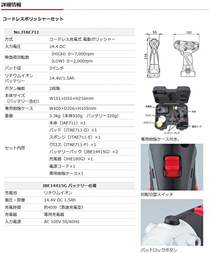 用途 ●塗装面の仕上げ、ガラス/樹脂面の拭き取り、仕上げ等 ●小型軽量ボディで通常のポリッシャーでは磨きにくい凹凸部や部分仕上げ作業に便利です。 ●コードの取り回しが困難な電車・船舶・飛行機等の室内ガラス磨きにも有効です。 特長 ●回転数を2段階(HIGH/LOW)に調整が可能。 トリガーの引き具合で回転を調整できるティージングスロットルを採用。 ●トリガーを引いている間、パッドを一定の回転数で回転させる自動・手動切り替えボタン機構付き。 ●スパナ等での回り止めが不要なパッドロックボタン付き。 ●汎用性の高い3インチパッドの採用で既成品の使用も可能。 ●ブラシ内蔵モーターを新採用。 ●JTAE115/315のバッテリー及び充電器の使用が可能。 ●残量がひと目で分かるバッテリーインジケーター。 ●バッテリーは2個付きで、不意なバッテリー切れにも安心。 ※バッテリー、充電器及び、パッド(JTAE711-D)、スポンジ(JTAE711-E)、クロス(JTAE711-F)は修理対象外です。