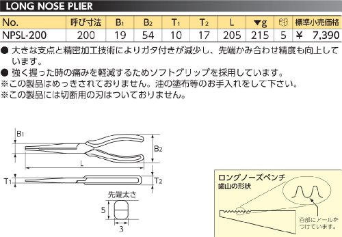 【KTC】 ネプロス ロングノーズペンチ [型番:NPSL-200]