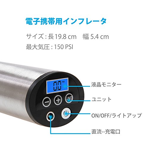 - 急速充電とポンピング - 完全充電に約1.5時間。自転車には約2分かかり、完全に膨らませるには約3分かかります。タイヤインフレータは150Psiまでポンプでき、精度は+/- 0.5Psiで自転車、 オートバイ、車(SUVを含む)は、トラックをサポートしていません。
