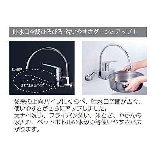 従来の上向きパイプに比べ、吐水空間が広々、使いやすさがさらにアップしました