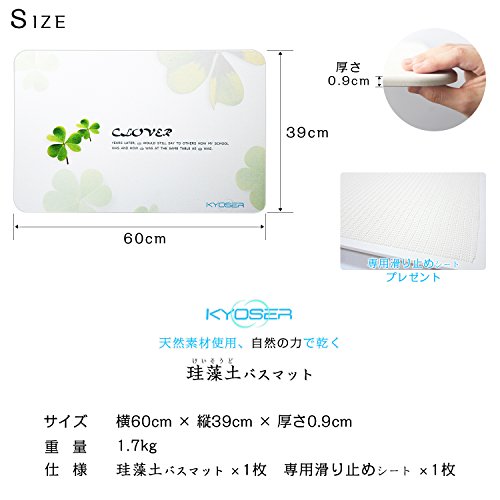 【KYOSER】珪藻土バスマット お風呂マット 足ふきマット オリジナルデザイン 消臭 速乾 防カビ 防ダニ 横60cm × 縦39cm 専用滑り止めシート付き (クローバー)