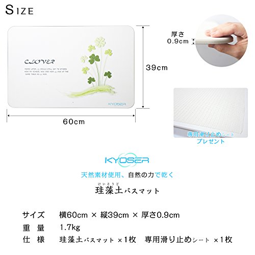 【KYOSER】珪藻土バスマット お風呂マット 足ふきマット オリジナルデザイン 消臭 速乾 防カビ 防ダニ 横60cm × 縦39cm 専用滑り止めシート付き (幸せクローバー)