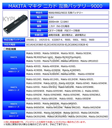 マキタ makita 9000 9002 9033 互換 9.6V 2000mAh 電動工具用 互換バッテリー 4093D 4093DW 4190DB 6095D 対応 DC1414 DC1439 DC1804 DC1215