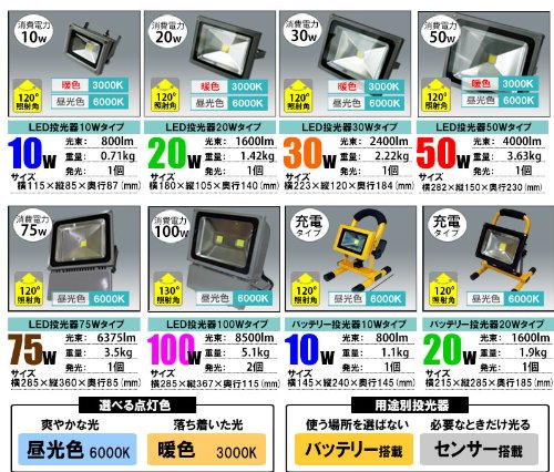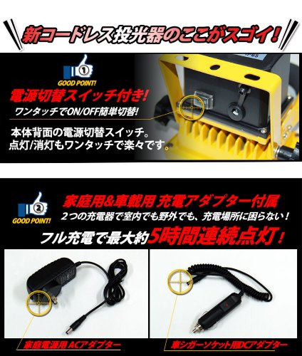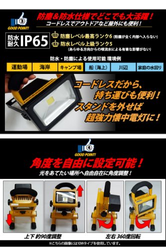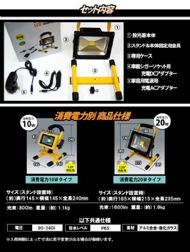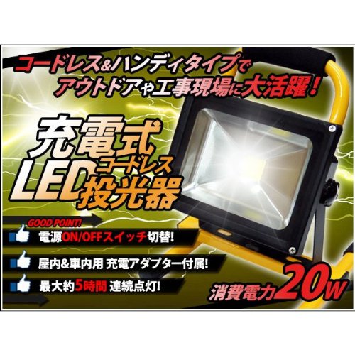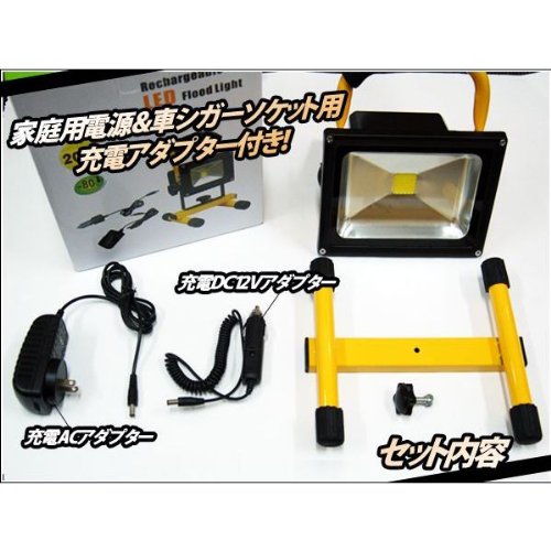 充電式 コードレス LED投光器 バッテリー搭載 20W 防水加工 200W相当  コンセント シガーソケット対応 集魚灯/キャンプ アウトドアに最適