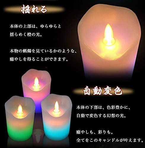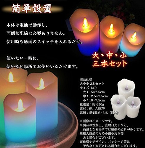 - 大中小 3本セット サイズ(約) 大:15×7.5cm 中:12.5×7.5cm 小:10×7.5cm 総重量:約650g 素材:蝋、ABS他 電源:単4電池×3本(別売)