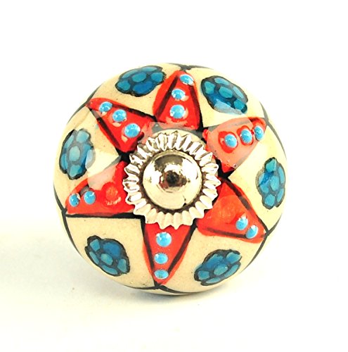 This exquisite ceramic door knob is hand made in Rajasthan, india by skilled artisans. The blue pottery of india is famous throughout the world for its quirky cheerful designs. The wide variety allows you to accessorise to your hearts content. The knob is 1.5 inch in diameter and 1.5 inch in depth . The brass hardware required to install comes standard with each knob. Installation is easy! Just drill an 1/8 " hole in the cabinet door and tighten the nut with a spanner. Disclaimer: Our Products are handmade to order for you. Although our artisans strive for consistency, The slight differences from piece will always be there and add to the charm of handmade products. Buy with confidence: We have a 14 days 100% money back guarantee