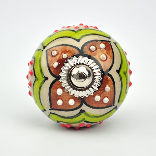 This exquisite ceramic door knob is hand made in Rajasthan, india by skilled artisans. The blue pottery of india is famous throughout the world for its quirky cheerful designs. The wide variety allows you to accessorise to your hearts content. The knob is 1.5 inch in diameter and 1.5 inch in depth . The brass hardware required to install comes standard with each knob. Installation is easy! Just drill an 1/8 " hole in the cabinet door and tighten the nut with a spanner. Disclaimer: Our Products are handmade to order for you. Although our artisans strive for consistency, The slight differences from piece will always be there and add to the charm of handmade products. Buy with confidence: We have a 14 days 100% money back guarantee