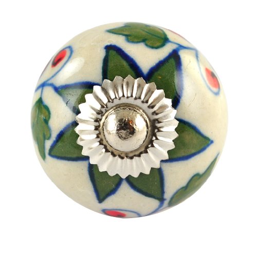 This exquisite ceramic door knob is hand made in Rajasthan, india by skilled artisans. The blue pottery of india is famous throughout the world for its quirky cheerful designs. The wide variety allows you to accessorize to your hearts content. The knobs are 1.5 inch in diameter and 1.5 inch in depth . The brass hardware required to install comes standard with each knob. Installation is easy! Just drill an 1/8 " hole in the cabinet door and tighten the nut with a spanner. Disclaimer: Our Products are handmade to order for you. Although our artisans strive for consistency, The slight differences from piece will always be there and add to the charm of handmade products. Buy with confidence: We have a 14 days 100% money back guarantee Disclaimer : All our products are exquisitely handmade, one piece at a time, using natural made products. It is therefore quite difficult if not impossible to make identical items. Even though we have the most attentive artisans who are the "Masters" of their respective crafts, and even though every effort is made to create only the best, there may be natural blemishes that should not be misconstrued as flaws. These are what make each piece of a handmade product charming and unique. The pictures may not be identical to the product you receive.