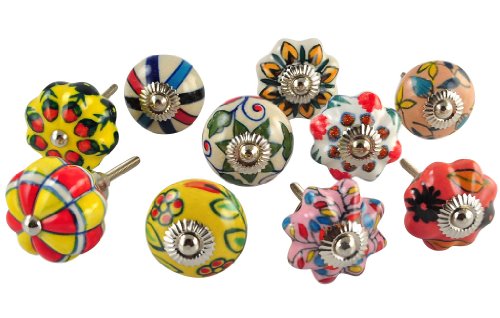 - Set of 10 Multicolor Ceramic cabinet knobs with fitting hardware.