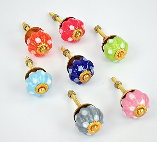 This is a set of 6 exquisite ceramic door knob are hand made in Rajasthan, india by skilled artisans. The knobs are 1 inch ( About the size of a quarter) in diameter and 1 inch in depth. The brass hardware required to install comes standard with each knob. Also available with chrome hardware on request. The knobs look amazing on smaller cabinets and drawers. Great for Kids room decor. Installation is easy! Just drill an 1/8 " hole in the cabinet door and tighten the nut with a spanner. Disclaimer: Our Products are handmade to order for you. Although our artisans strive for consistency, The slight differences from piece will always be there and add to the charm of handmade products. Buy with confidence: We have a 14 days 100% money back guarantee