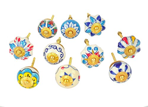 This is a set of 10 exquisite ceramic door knob are hand made in Rajasthan, india by skilled artisans. The knobs are 1.5 inch in diameter and 1.5 inch in depth. The brass hardware required to install comes standard with each knob. Also available with chrome hardware on request. The knobs look amazing on smaller cabinets and drawers. Great for Kids room decor. Installation is easy! Just drill an 1/8 " hole in the cabinet door and tighten the nut with a spanner. Disclaimer: Our Products are handmade to order for you. Although our artisans strive for consistency, The slight differences from piece will always be there and add to the charm of handmade products. Buy with confidence: We have a 14 days 100% money back guarantee