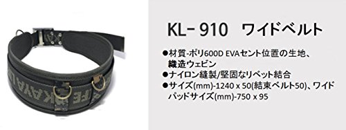 - KL-910 ワイドベルト:材質-ポリ600D EVAセント位置の生地、織造ウェビン/ナイロン縫製/堅固なリベット結合/サイズ(mm)-1240 x 50(結束ベルト50)、ワイドパッドサイズ(mm)-750 x 95