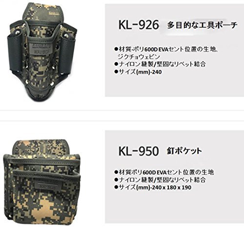 - KL-950 釘ポケット:材質ポリ600D EVAセント位置の生地/ナイロン縫製/堅固なリベット結合/サイズ(mm)-240 x 180 x 190
