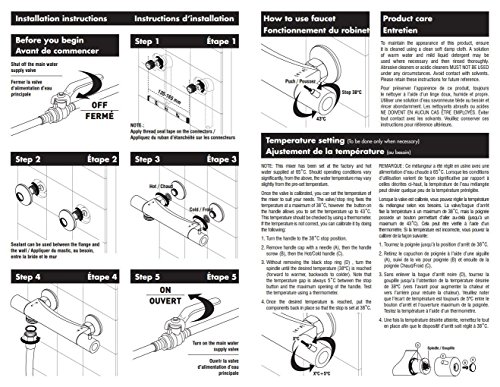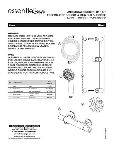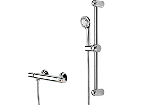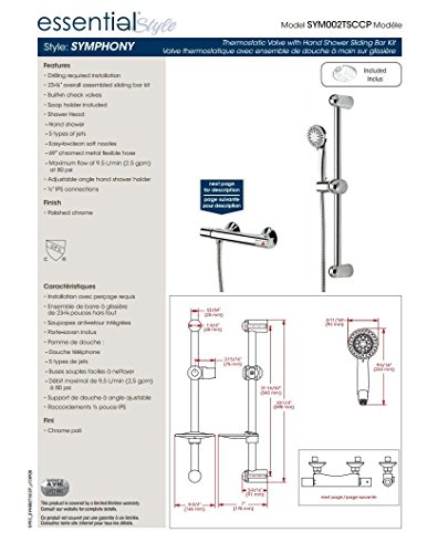 Essential style's thermostatic valve with hand shower sliding bar kit has a maximum flow of 9.5 l/min at 80 psi. Its polished chrome finish gives it a sleek look and features include built-in check valves, a soap holder, easy-to clean soft nozzles, five types of jets, an adjustable angle hand shower holder.