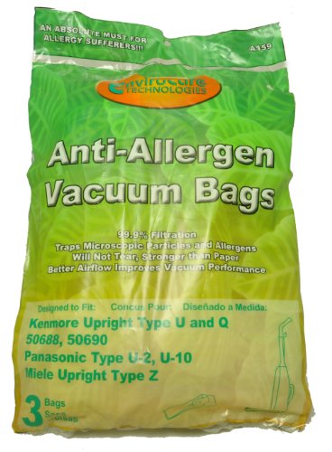 Works With: Kenmore 50688 Kenmore 50690 Kenmore Type U Kenmore Type O Panasonic Type U-2 Miele Type Z Description:Anti-Allergen White Cloth Synthetic Disposable Bags Made By Envirocare.99.9% Microfiltration, 3 Bags In Pack