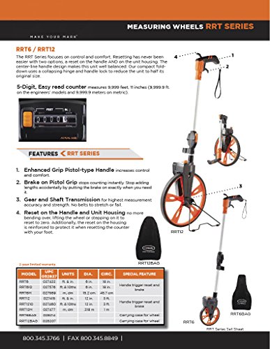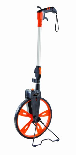 Enhanced grip pistol-type handle increases control and comfort; two reset buttons, one on the handle and the other on the unit housing; reinforced reset on housing protects wheel from accidental foot reset and brake on pistol grip instantly stops counting and adding lengths; collapsing hinge snaps into extended lock and it disconnects if you forget to press the unlock trigger; compact fold-down reduces to 0.5 size for storage and portability; 5 digit, easy to read magnified counter; gear and shaft transmission for measurement accuracy and strength; lock the handle in place when wheel is not in use.