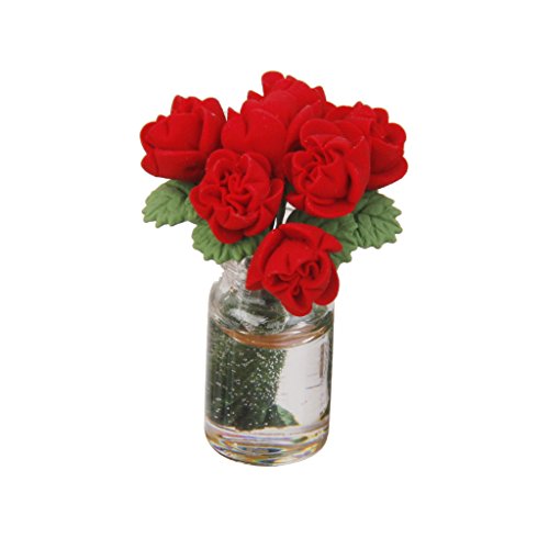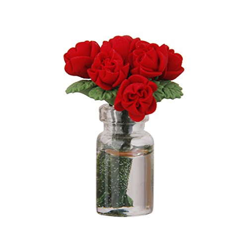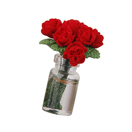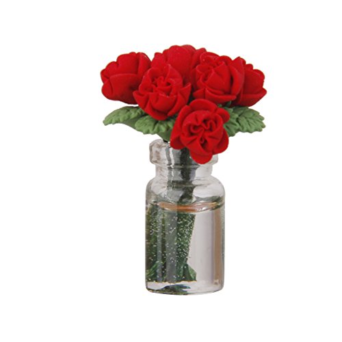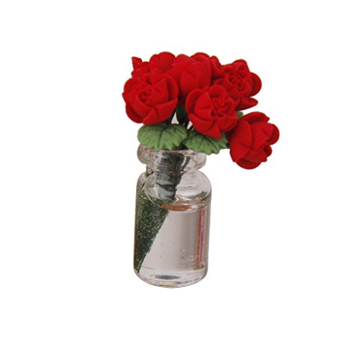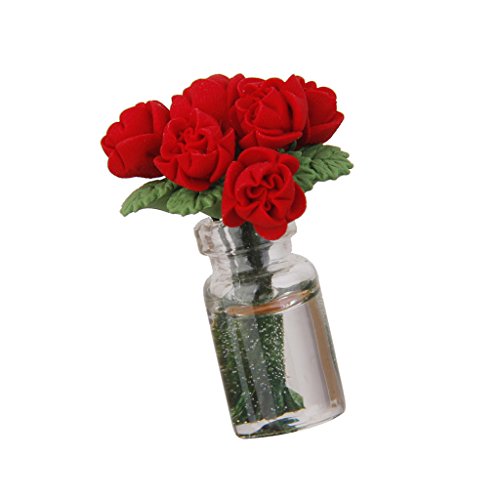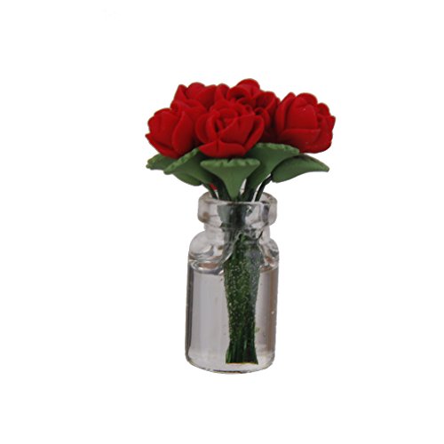 この小型の赤い花が絶妙に設計され、作られて上昇しました。素敵なクリアガラスの花ポットに入れ、明るい色の葉、花、。ドールハウスのリビングルームや寝室、大きなための絶妙な装飾はスペースの味を高めるために!