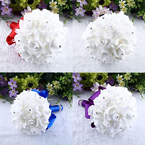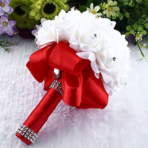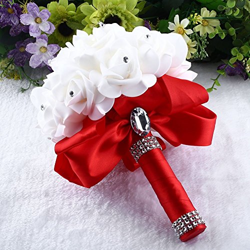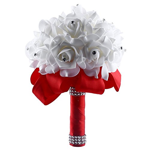 素材:リボン、人工ローズ花の装飾のラインストーン:真珠と機会:それは結婚式、パーティー、オフィス装飾、装飾、祭壇、教会、コサージュ、ピューボウ、受付センターピースに最適です。 特徴:1.この野性花の花束は、現実的なバラの花で作られています。2.ハンドルはサテンリボンで包まれ、ラインストーンで飾られています。