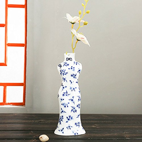 TOPmountain ブルーホワイトポーセリン チョンサム花瓶 中国の花の花が描か 彫刻像セラミック ホームデコレーション