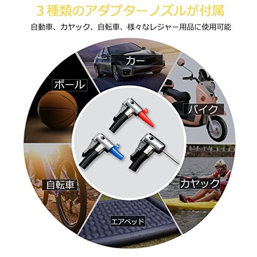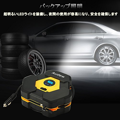 AUDEW エアコンプレッサーコンパクト 車用空気入れ 空気圧測定 LEDライト付き シガーソケット接続式 3種類アダプターノズル付き レジャー用品