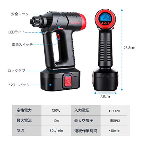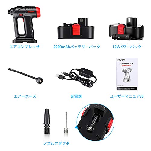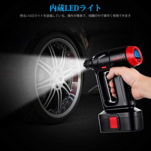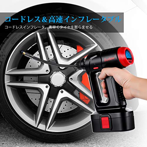 - ✔【ポータブルコードレス&ラピッドインフレ】 - Audewタイヤインフレーター内蔵の大容量充電式2000mAhリチウムバッテリーで、フラットから35psiまでの中型車用タイヤを6〜8分、最大圧力100PSIで膨らませることができます。