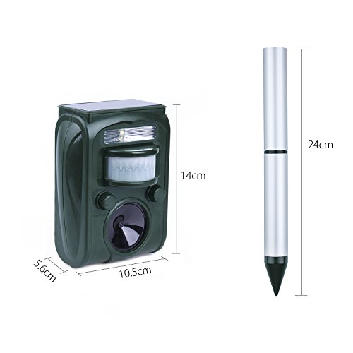 2017の最新バージョン、超声波パワーとLED強力フラッシュも改良しました、検知範囲が広いになって、5モートで設定可能な周波頻度で野生動物、猫、犬、ネズミ、キツネ、鳥、げっ歯類などと夜行性動物を傷つけずに追い払います。誰も傷つかいで害獣害鳥とさよならでき、人体と環境に無害。。