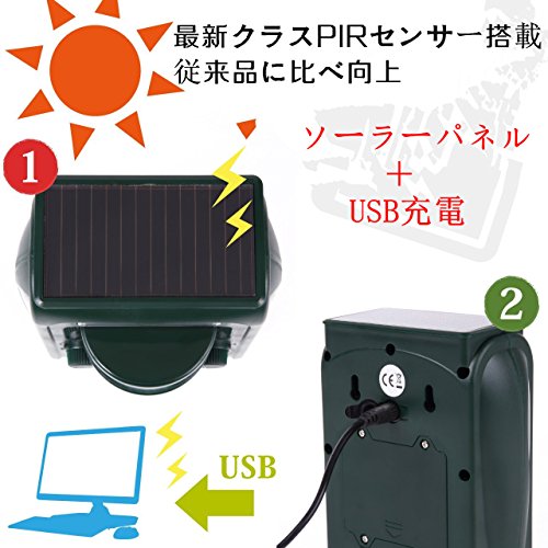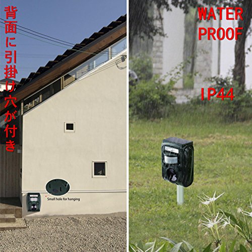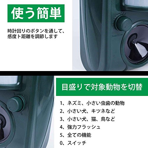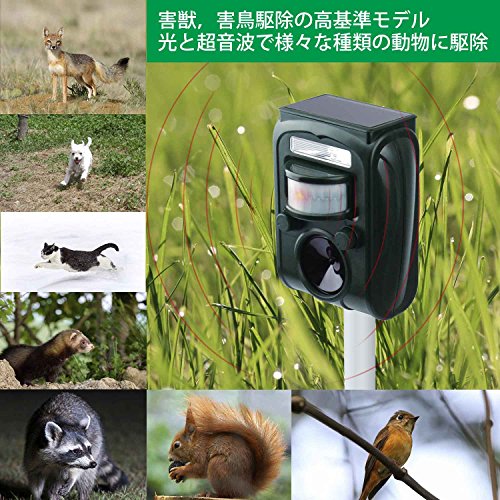 - 2017の最新バージョン、3つの優れた撃退攻撃,強力LEDフラッシュ、赤外線自動感知センサー、超音波発生スピーカーの3つでどんな害獣が来てもしっかり家や庭、畑を守る。超声波パワーとLED強力フラッシュも改良しました、検知範囲が広いになって、5モートで設定可能な周波頻度で野生動物、猫、犬、ネズミ、キツネ、鳥、げっ歯類などと夜行性動物を傷つけずに追い払います。誰も傷つかいで害獣害鳥とさよならでき、人体と環境に無害。