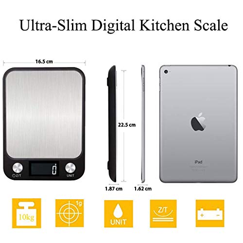 - 【コンパクト&お洒落】モダンを馴染み、洗練されたシンプルなデザイン。デジタルスケール本体はわずか335g、サイズは約22.5×16.5×1.9cm。コンパクトで軽量、収納や持ち運びもラクラク、さらにお洒落でキッチンを飾って現代的な空間に!