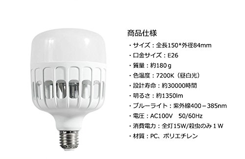 - LED・殺虫:15W昼光色7200K LED+UV光源吸引式高電圧殺虫