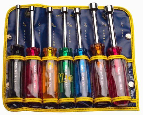 7-Piece Nut Driver Set - 3'-Shanks contains seven hollow-shaft nut drivers in the most popular hex sizes. It also includes a convenient vinyl pouch that hangs up / rolls up. Each nut driver feature smooth Comfordome handles that fit the palm of the hand comfortably and they are color-coded for easy identification. The hollow shafts facilitate work on stacked circuit boards or other long bolt applications. These nut drivers have a chrome-plated shaft that helps prevent corrosion and the internal flanges provide solid, twist-resistant shaft anchor. They meet or exceed applicable ASME / ANSI specifications.